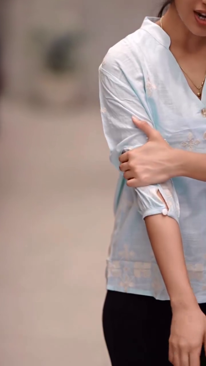 π Relaxed Fit Design: Features a V-neckline, 3/4th balloon sleeves, and detailed embroidery at the hem.