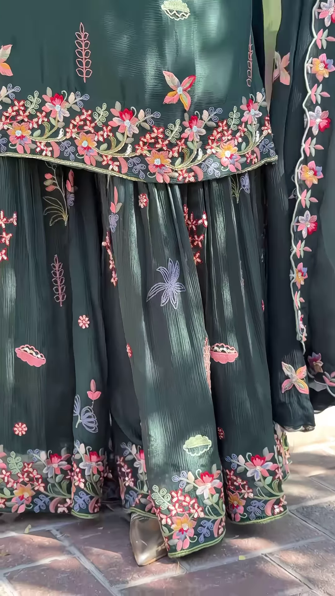 Completing the set is a matching dupatta, a long scarf that is an essential part of traditional Indian attire. The dupatta is typically made from a lightweight fabric that complements the kurti and gharara, such as chiffon, silk, or net. It often features coordinating embroidery, printed designs, or embellished borders that tie the entire ensemble together. The dupatta can be draped in various stylish ways, adding to the grace and elegance of the outfit.