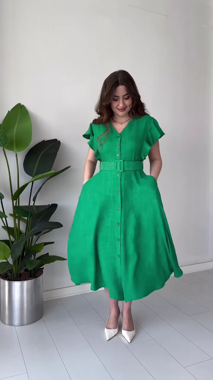 Running down the front of the dress is a classic button-down closure. This detail adds a touch of timeless style and allows for versatile wear – you can fasten all the buttons for a more formal look or leave a few undone at the top for a more relaxed and casual vibe, perfect for the lifestyle in Ahmedabad.