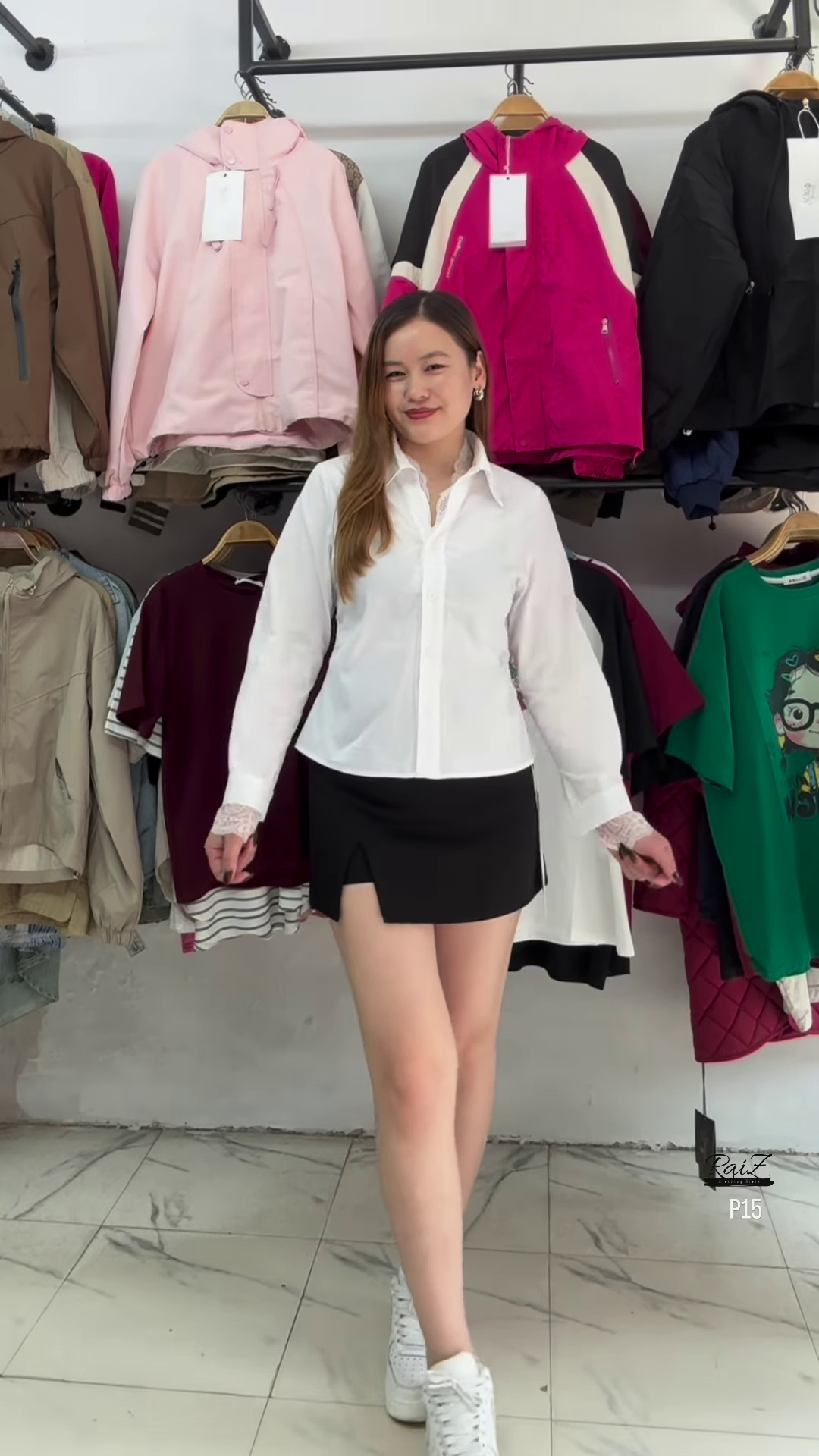 The model is wearing the blouse with a black mini skirt that features a subtle slit on one side. The skirt complements the blouse, creating a chic and versatile outfit that could be suitable for various occasions, from professional settings to more casual outings. The background shows a clothing rack filled with other garments, suggesting a retail environment or a fashion setting. The lighting is even and bright, ensuring that the details of the blouse, particularly the lace cuffs, are clearly visible. The overall presentation emphasizes the blouse’s style and potential as a key piece in a modern wardrobe.