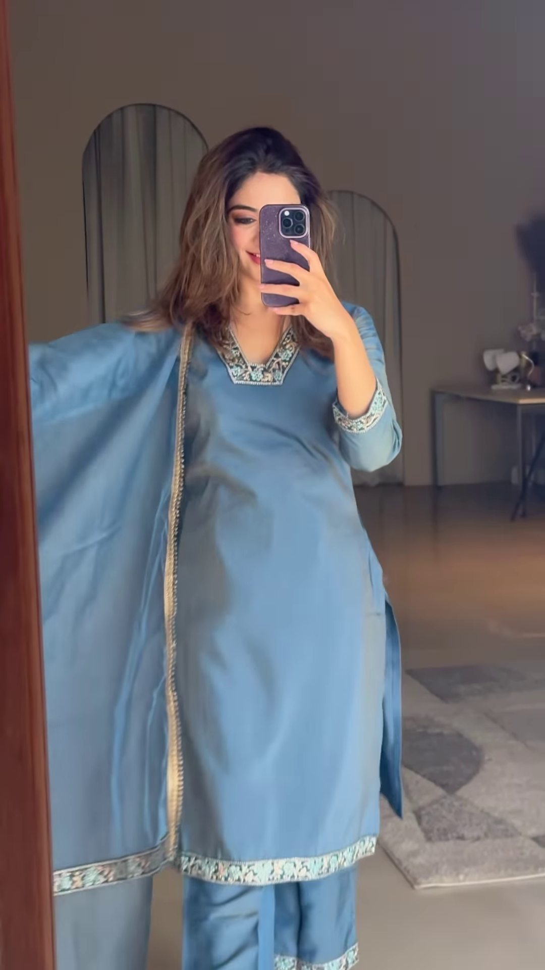 This elegant off-white embroidered kurti set with a contrasting dupatta is a versatile and sophisticated choice for women in Ahmedabad, Gujarat, India. Its subtle yet intricate embroidery and the beautiful contrast of the dupatta make it suitable for various occasions, from daytime events to evening gatherings. Pair it with delicate jewelry and comfortable ethnic footwear to complete a refined and graceful look that embraces the timeless elegance often admired in Gujarat.