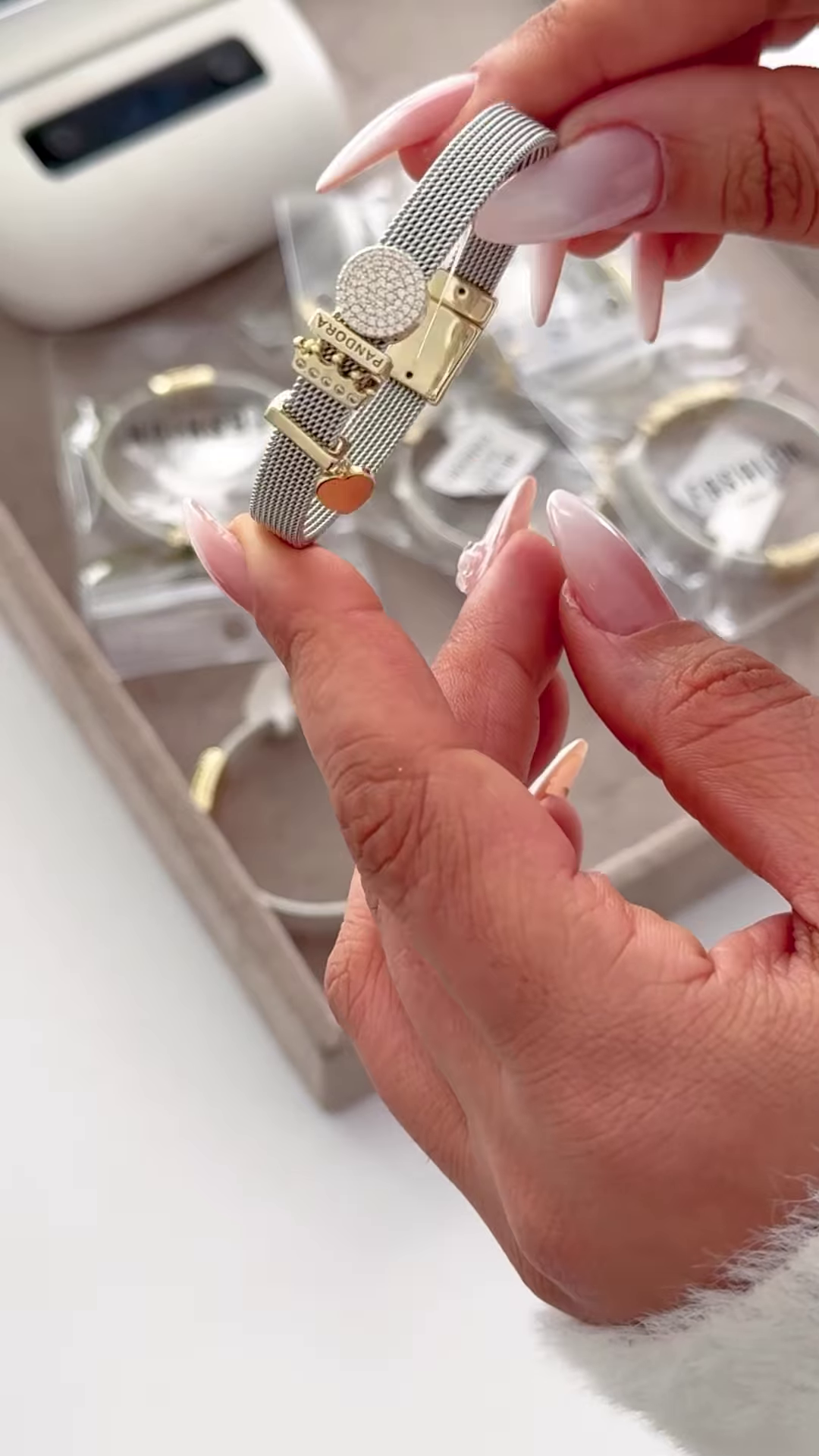 Elegant Silver-Toned Mesh Bracelet with Gold Accents and Crown Charm
