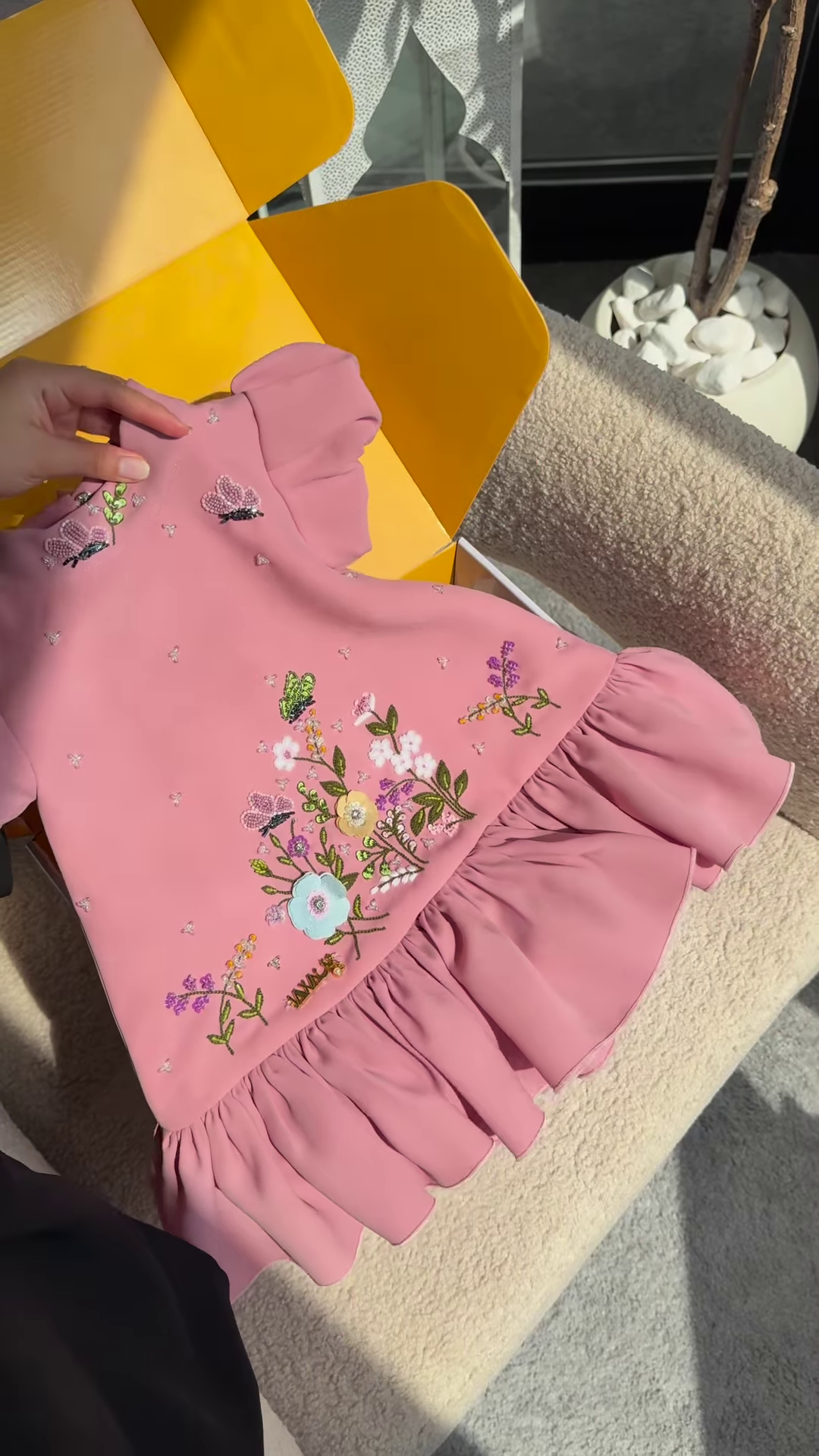 This image showcases a charming white dress, elegantly displayed as it’s being lifted from a bright yellow box. The dress, made from a smooth, flowing fabric, features a prominent bow detail at the shoulder, adding a touch of sophistication and grace. The design is simple yet refined, making it versatile for various occasions. The dress is held by a person with manicured hands, which adds a sense of care and highlights the garment’s delicate nature.