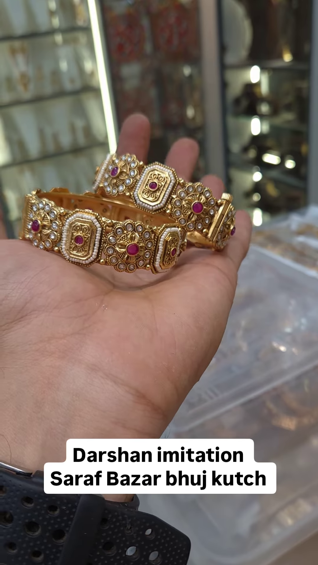 The hand holding the bangles provides a sense of scale and allows for a close-up view of the intricate detailing. The background is slightly blurred, suggesting a jewelry store or display setting, with hints of other jewelry items visible. The lighting is focused, highlighting the shine of the gold and the facets of the stones and pearls. These bangles would be a statement piece, perfect for adding a touch of traditional elegance and vibrant color to any attire, particularly for special occasions or festive events. The combination of the classic gold tone with the rich ruby and pearl embellishments offers a timeless and sophisticated appeal.