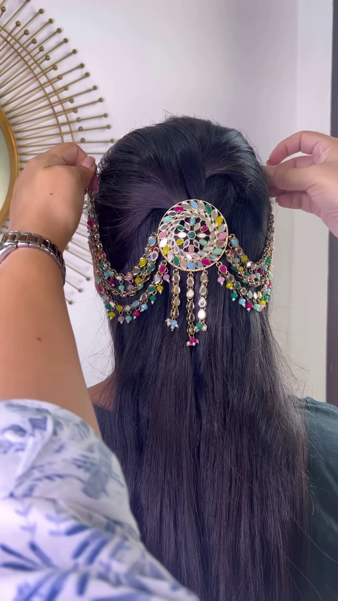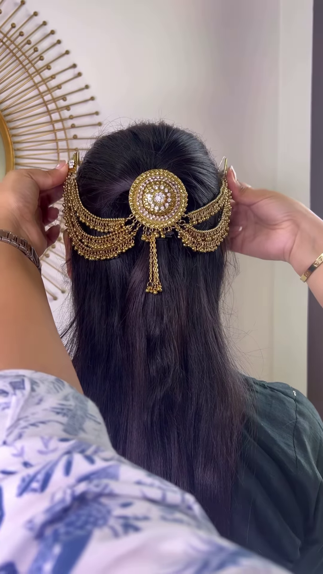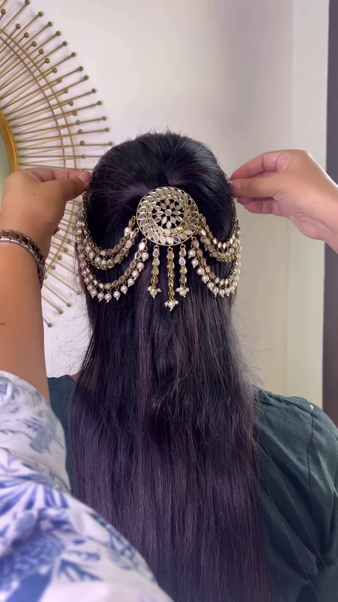A distinctive and charming feature of this hair chain is the inclusion of multiple dangle elements, typically bell-shaped (similar to jhumkas), suspended from the ends of the chains. These small, ornate bells are also crafted in the oxidized silver tone and are often embellished with their own set of sparkling stones or delicate pearl-like drops at their base. These dangling bells not only add visual interest and a sense of playful movement but may also produce a gentle, melodic tinkling sound with every turn of the head, adding an auditory dimension that is deeply rooted in cultural traditions.