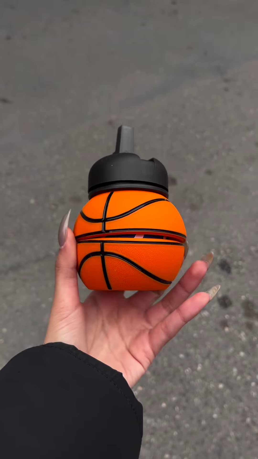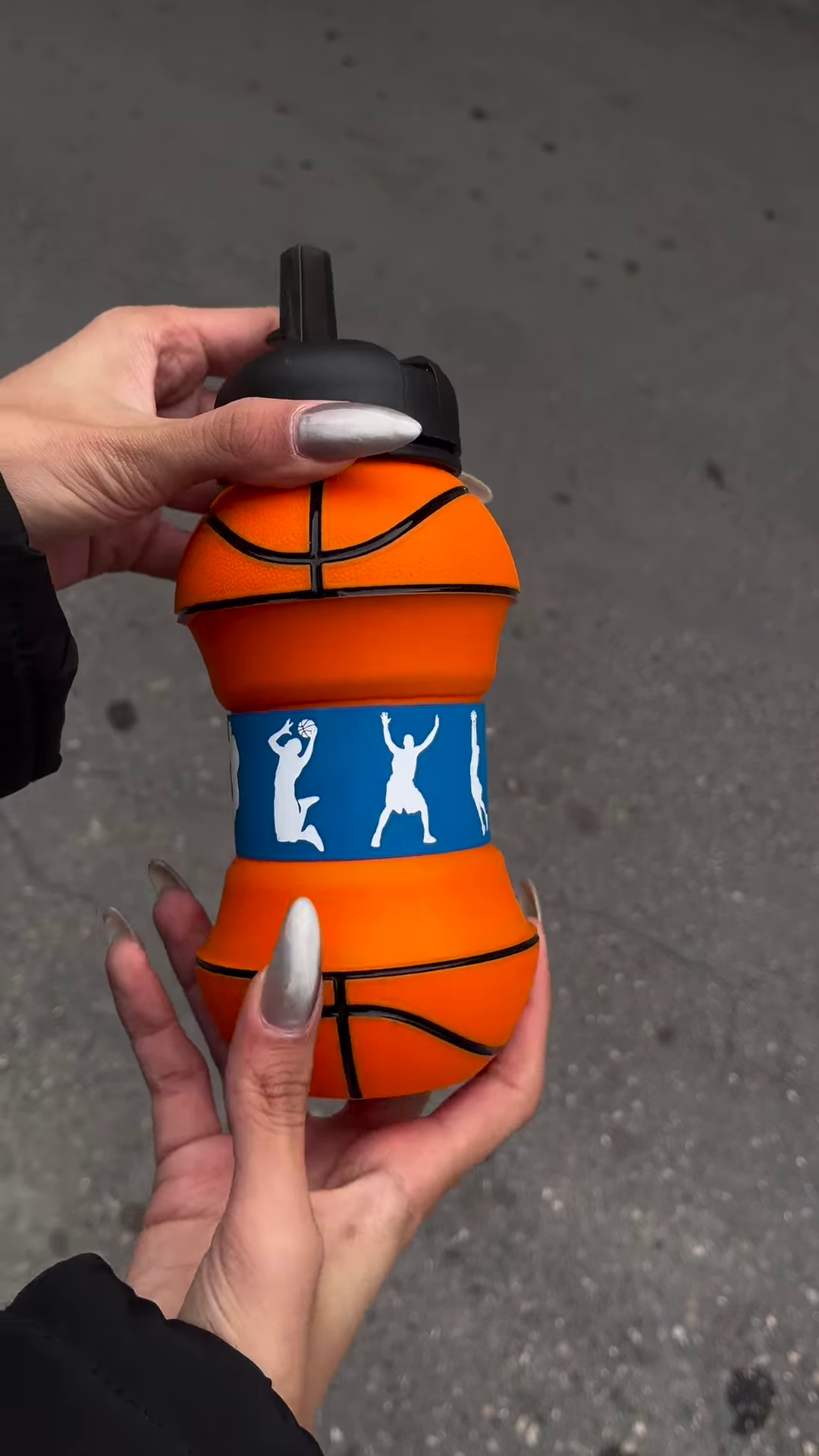 Add a touch of sporty fun to your hydration routine with this distinctive basketball-shaped water bottle featuring dynamic player silhouettes.