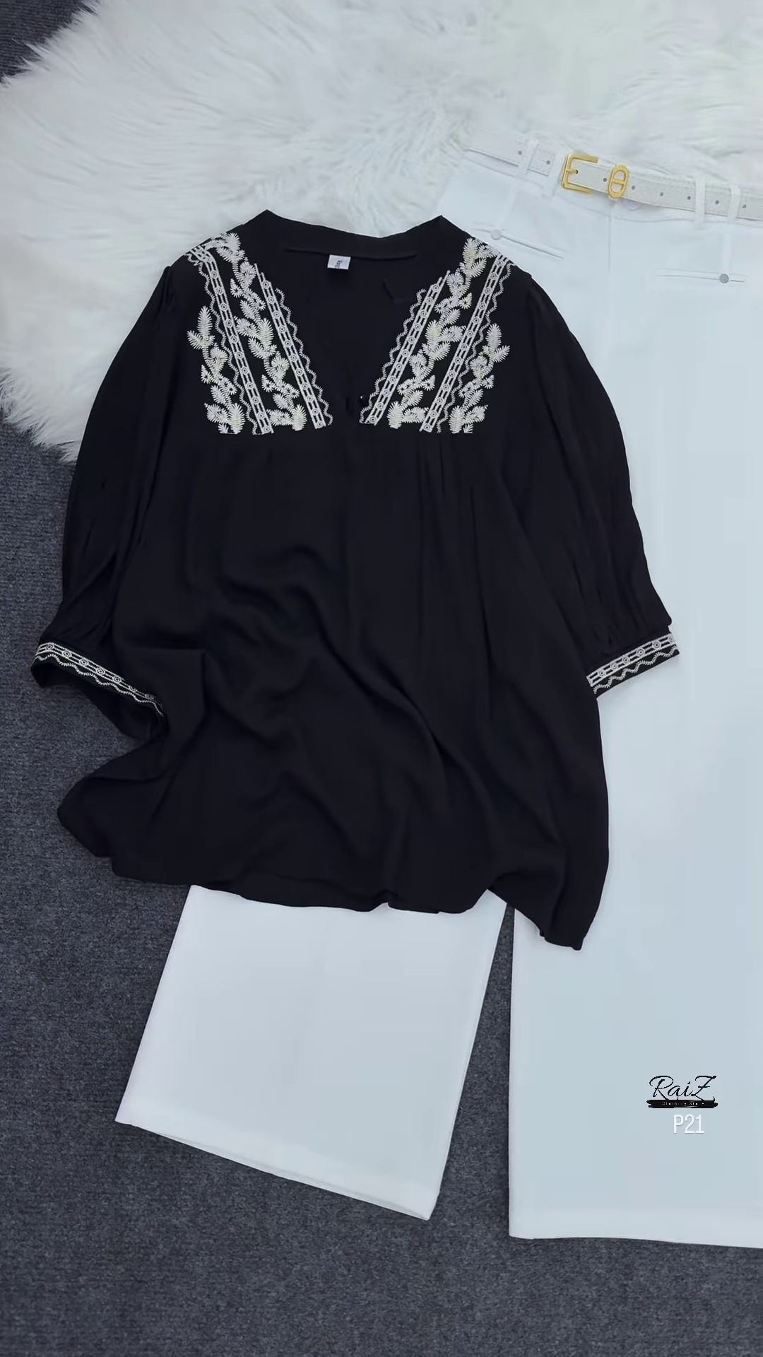 This image showcases a stylish mint green tunic top paired with crisp white trousers, laid out on a textured, off-white surface that resembles fur or a soft rug. The tunic top is the focal point, featuring a V-neckline and three-quarter length sleeves. The neckline and the cuffs of the sleeves are adorned with intricate black embroidery, creating a striking contrast against the light green fabric. The embroidery appears to have a floral or foliate motif, adding a touch of bohemian or ethnic flair to the garment. The fabric of the tunic seems lightweight and slightly sheer, suggesting a comfortable and breezy feel, ideal for warmer weather. The top has a relaxed, slightly flowy fit, indicating ease of movement and a casual yet chic style.