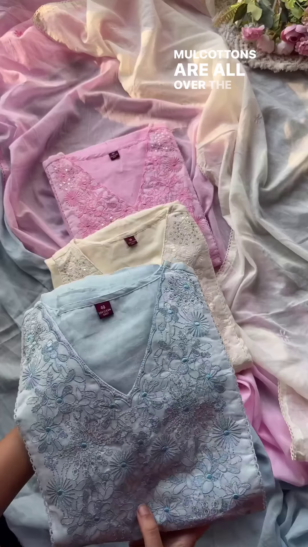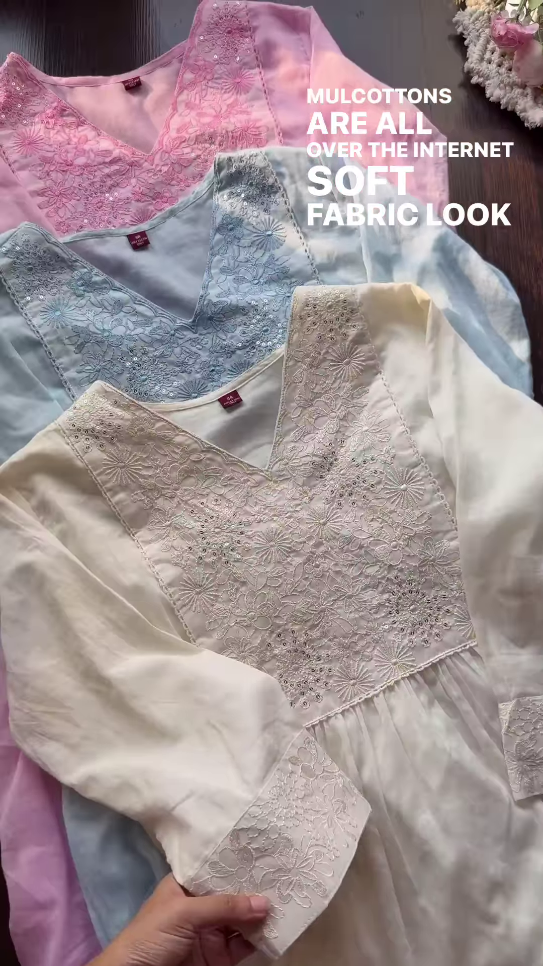 Step into softness and style with this trio of mulcotton V-neck kurtas, each featuring delicate floral embroidery on the neckline and cuffs. Available in pink, light blue, and cream, these garments are crafted from ultra-soft mulcotton fabric—celebrated across the internet for its breathable comfort and elegant drape. Whether you’re curating a boutique catalog or launching a WhatsApp campaign, this set offers timeless appeal and versatile styling.