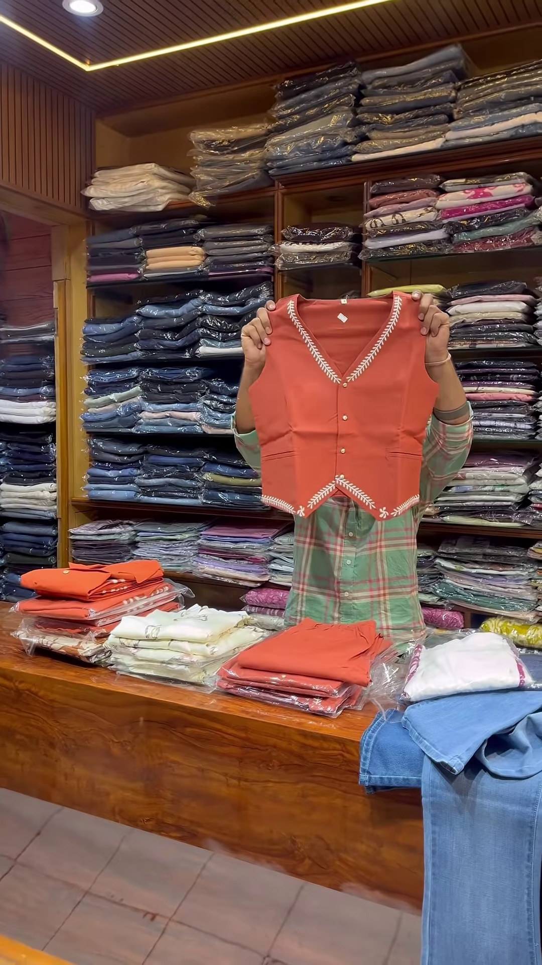Add a vibrant layer of ethnic charm to your wardrobe with this orange sleeveless vest, featuring white embroidered edging and a classic V-neck button-down design. Perfect for layering over kurtas, shirts, or fusion outfits, this vest is ideal for boutique collections, festive campaigns, and casual ethnicwear catalogs.