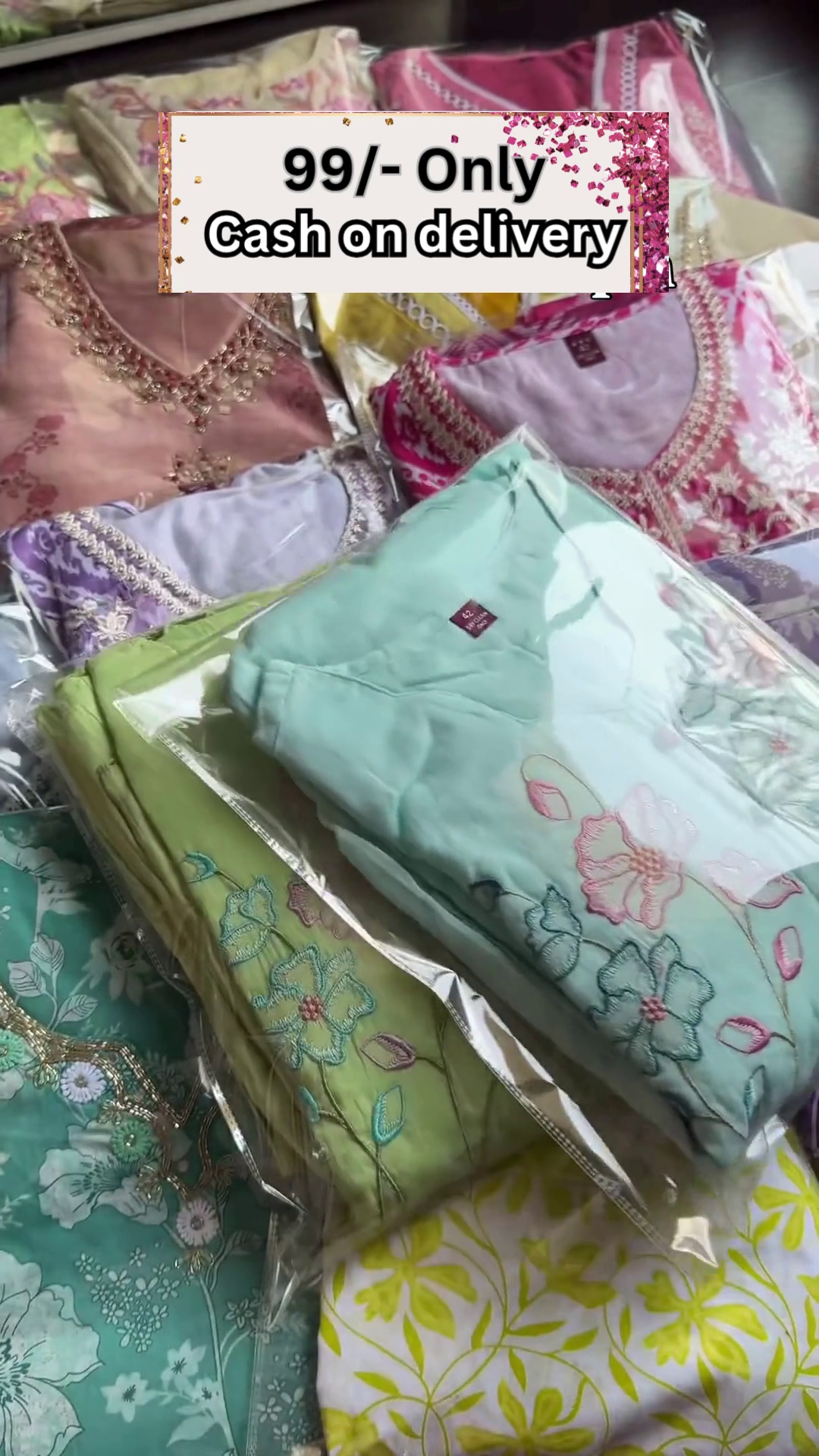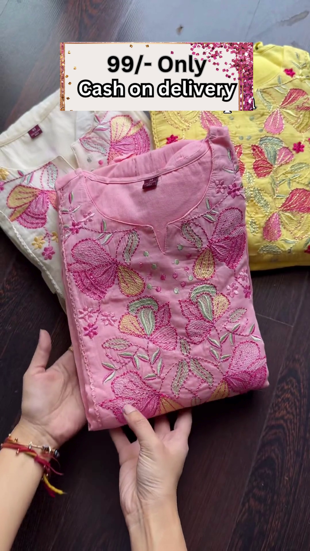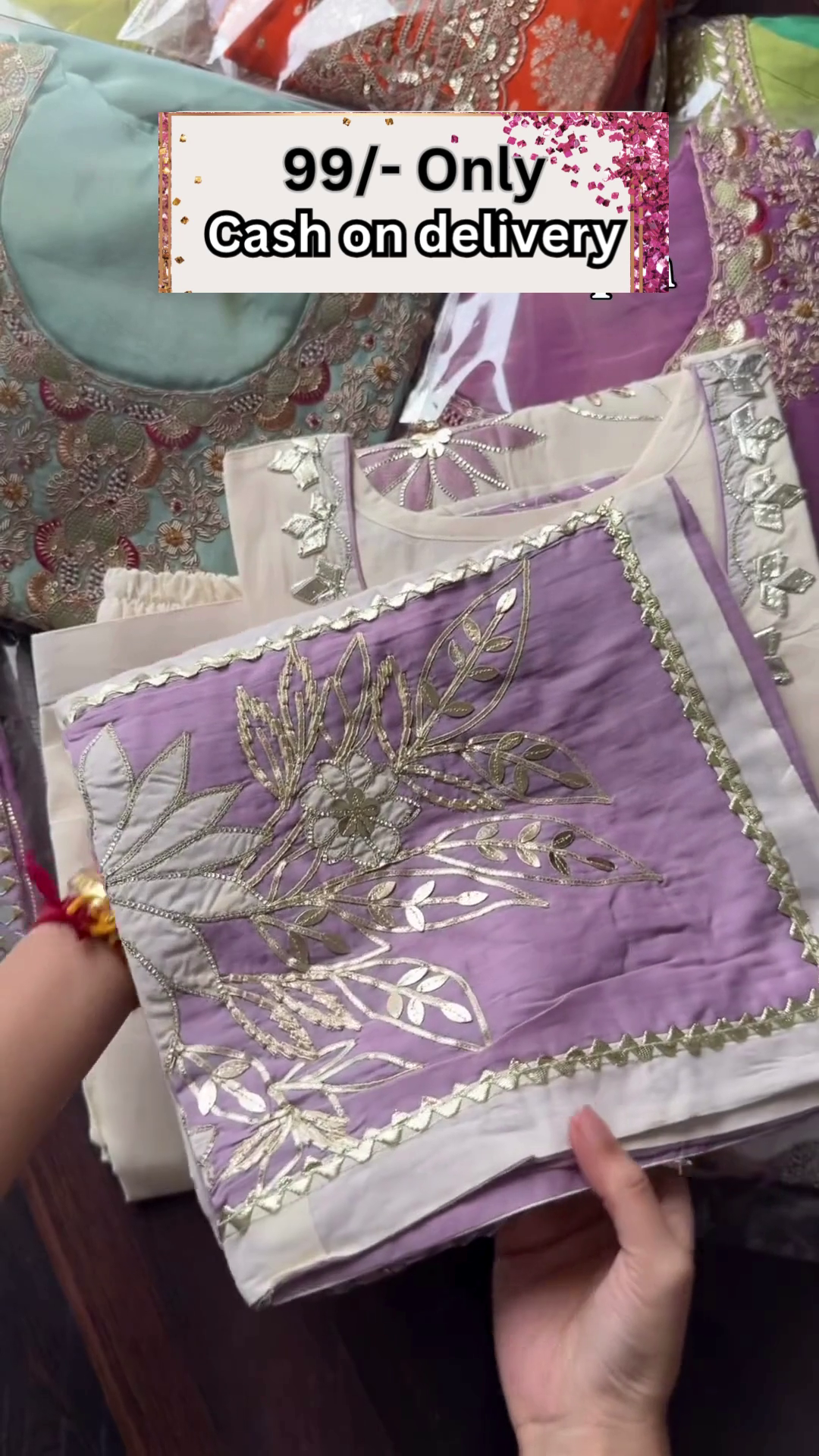 This visual setup—handheld product, organized backdrop, and bold pricing—serves well in WhatsApp promotions, social reels, Facebook ads, or e-commerce banners targeting high-volume ethnicwear seekers. It positions your offering as value-driven, variety-rich, and ready to move.