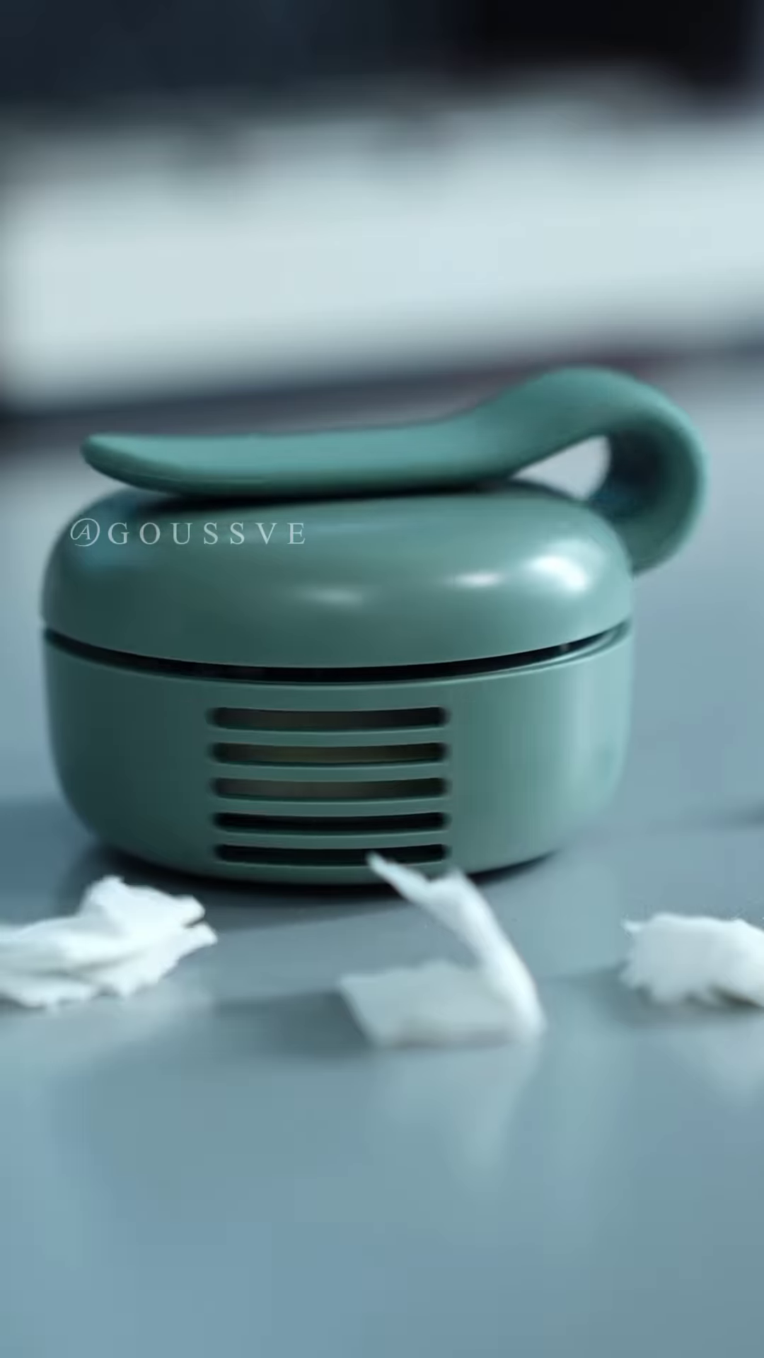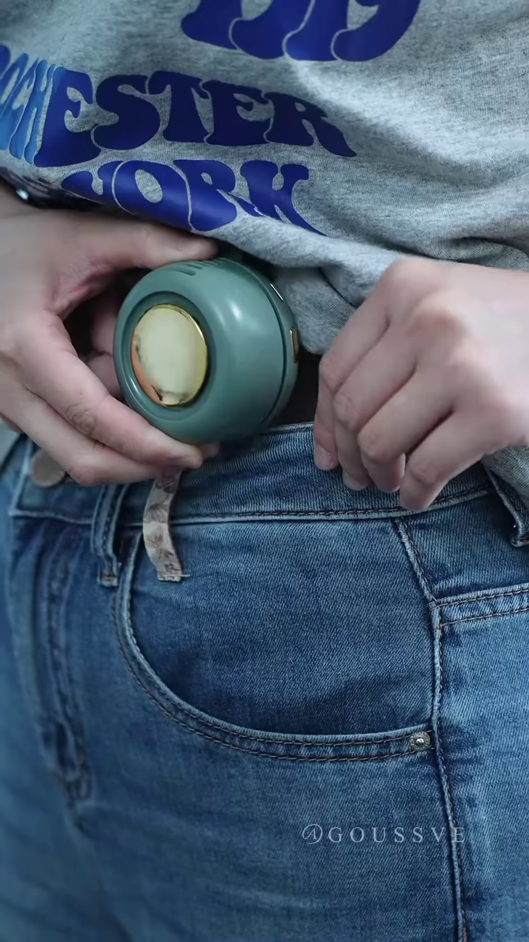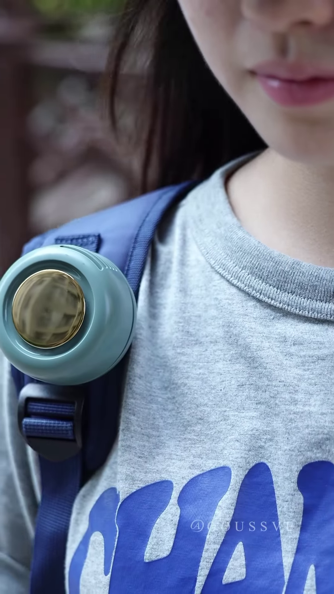 The background is blurred, but hints of green and blue suggest an outdoor setting, possibly a park or a recreational area, where such a portable fan would be particularly useful for staying cool during outdoor activities.