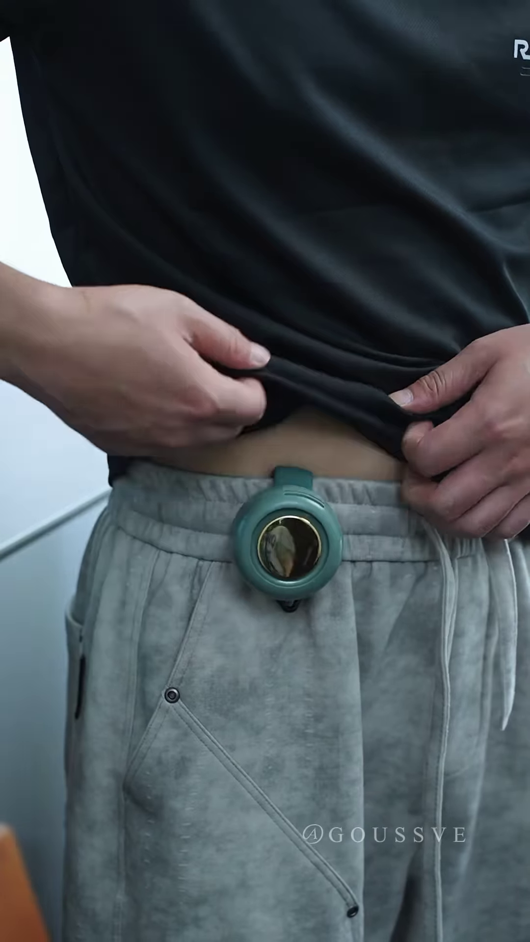 close-up of a person attaching a small, portable fan to the brim of a baseball cap. The fan is designed to clip onto the underside of the hat’s brim, providing a direct stream of cool air to the face and neck, ideal for staying comfortable in warm weather.