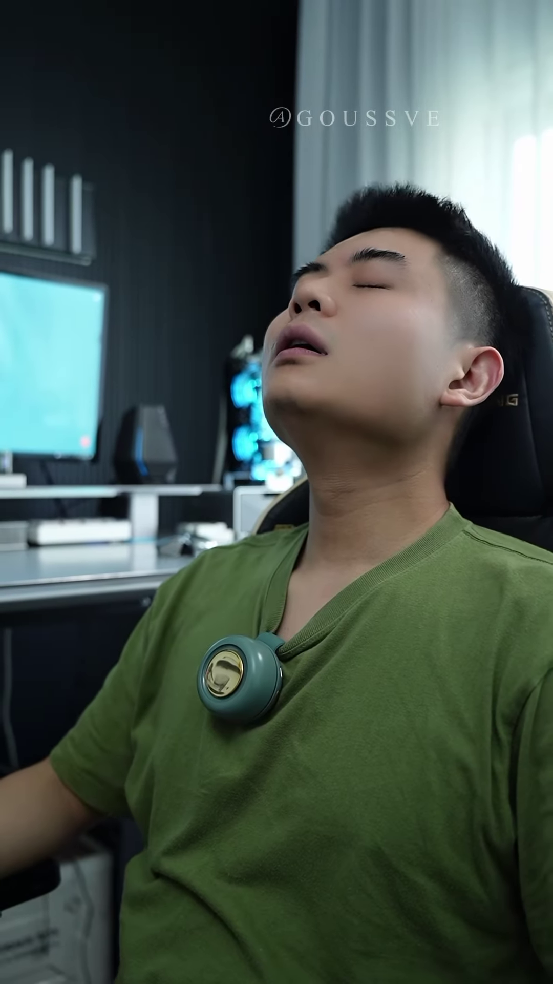 The fan itself is a compact, circular unit in a muted green or teal color. It features horizontal vents on the front through which the air is expelled. A flexible, curved arm extends from the fan and has a clip mechanism designed to securely attach to the brim of the hat. The size of the fan suggests it is lightweight and won’t be cumbersome to wear.