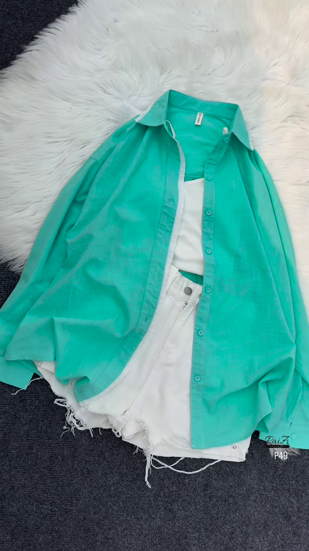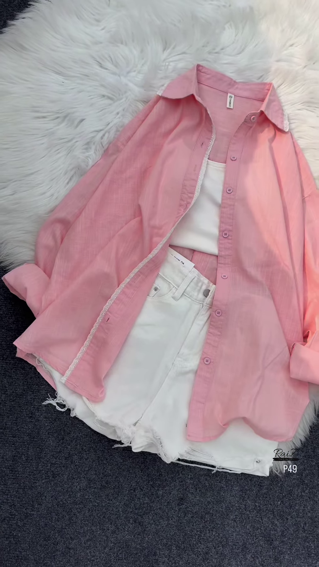 Beneath the overshirt is a simple white tank top. The neckline and straps of the tank are visible, providing a clean and contrasting base layer. Below the tank top are a pair of white denim shorts. The shorts have a frayed or distressed hem, adding a touch of casual edginess to the outfit. The waistband and pockets of the shorts are visible, indicating a standard design.