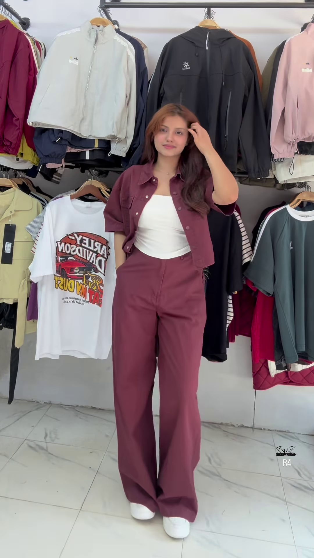 The bottoms are likely a pair of jeans or a skirt, also in matching grey denim. The style could range from skinny jeans to wide-leg trousers or a mini to midi skirt, depending on the overall aesthetic of the set. The matching denim creates a cohesive and fashionable look that’s both comfortable and stylish.