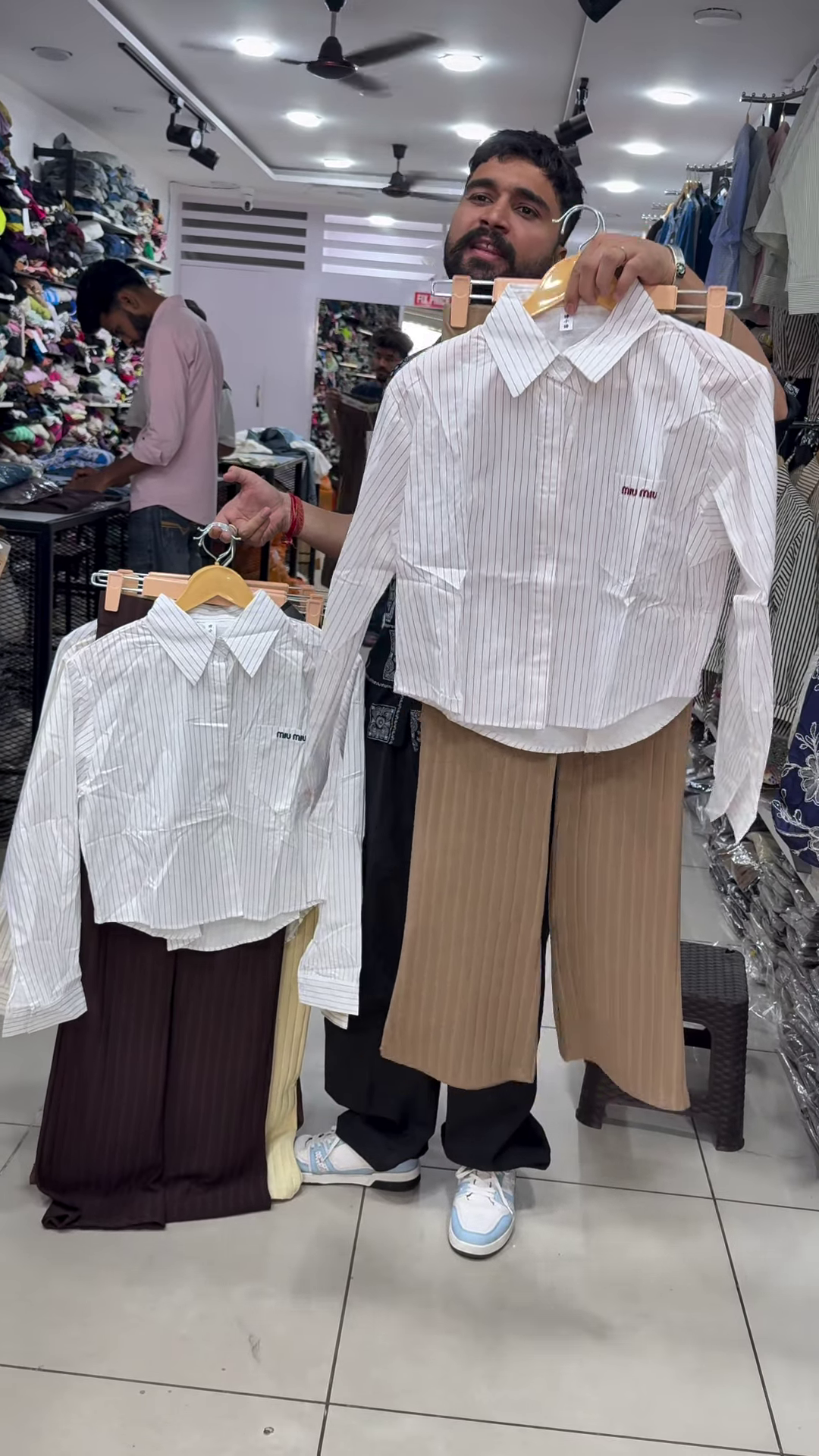 trendy and contemporary women’s two-piece set, featuring a cropped long-sleeved shirt and wide-leg pleated pants. The set is held up by a person in a retail environment, highlighting its style and potential for customers.