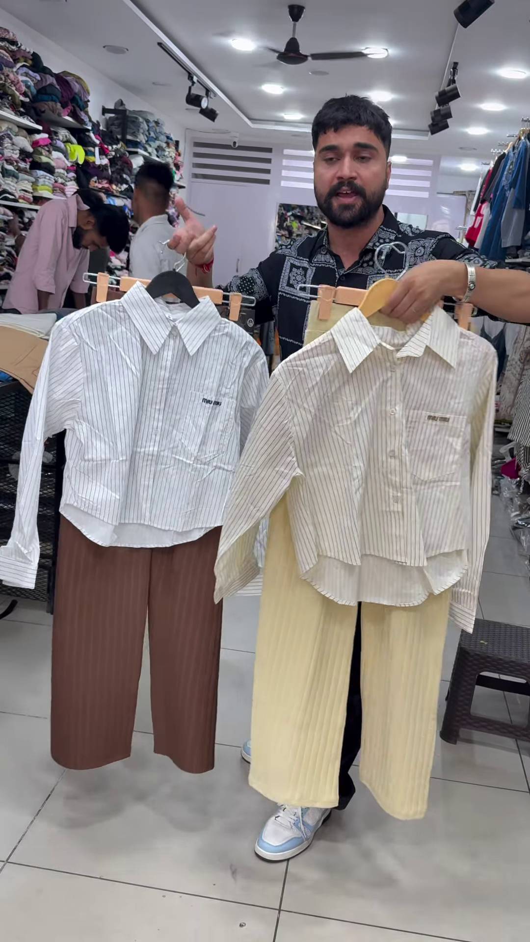 The overall impression of the set is chic and modern, blending classic elements like pinstripes and pleats with contemporary silhouettes like the cropped top and wide legs. This set would be versatile for various occasions, from casual outings to more styled events, depending on how it is accessorized. The combination of the structured shirt and the flowing pants creates a balanced and fashionable look. The availability of the set with different colored pants, as hinted by the other garment visible, suggests options for personal preference and styling versatility. This co-ord set offers a trendy and effortless way to achieve a put-together look.