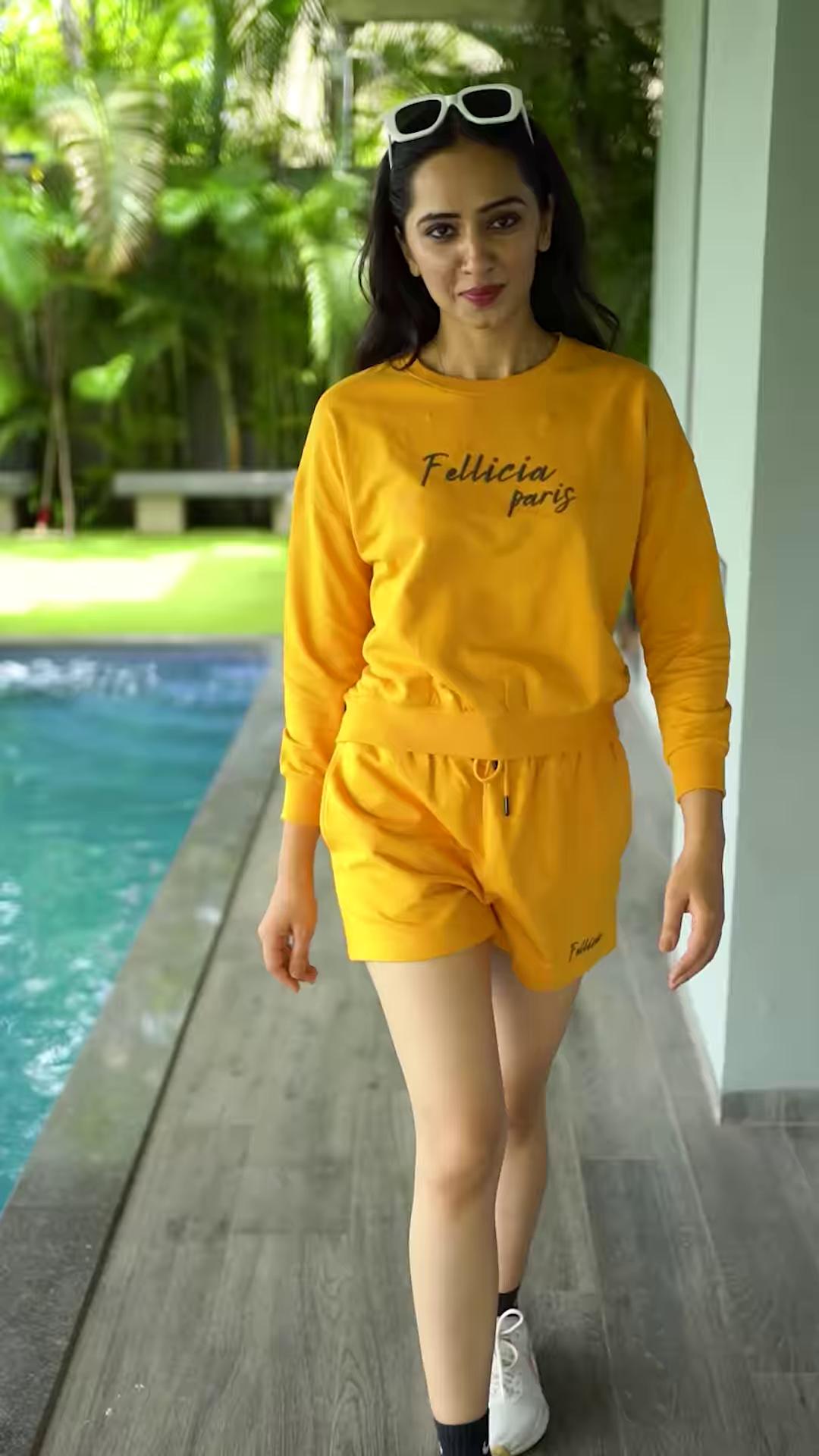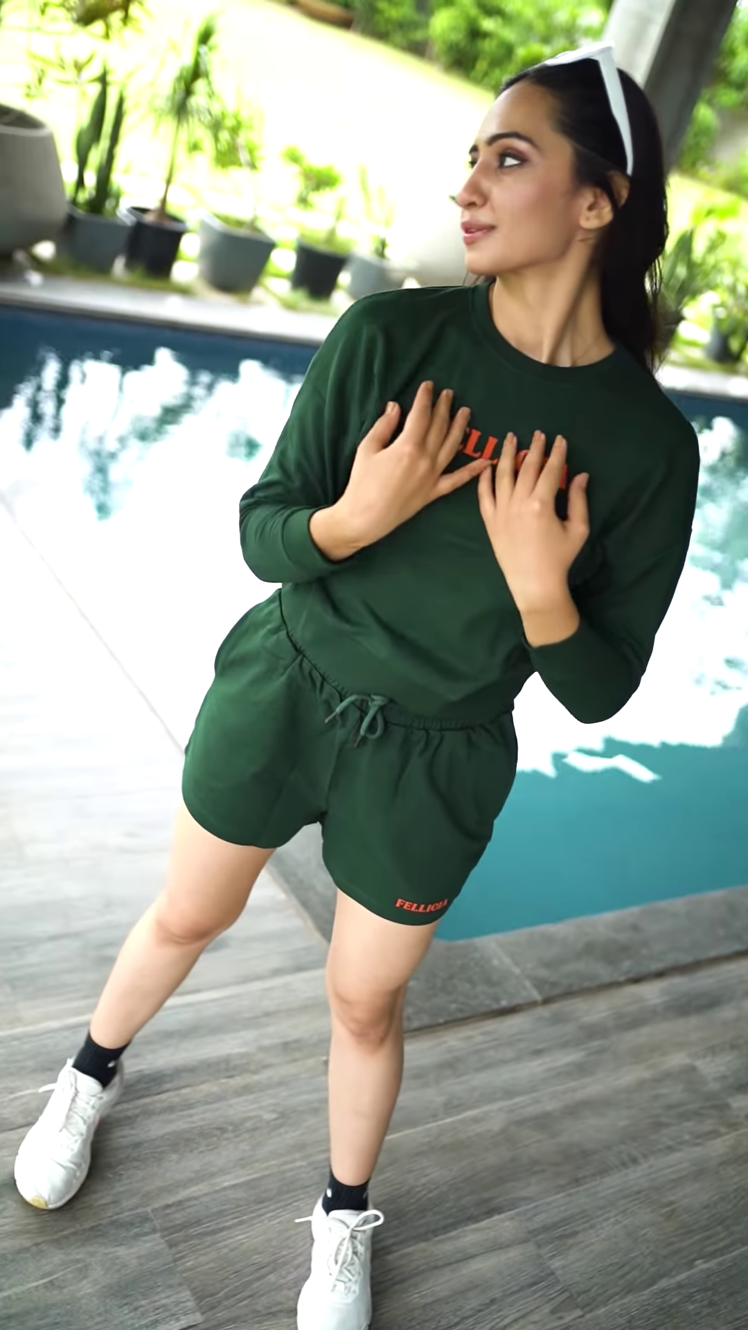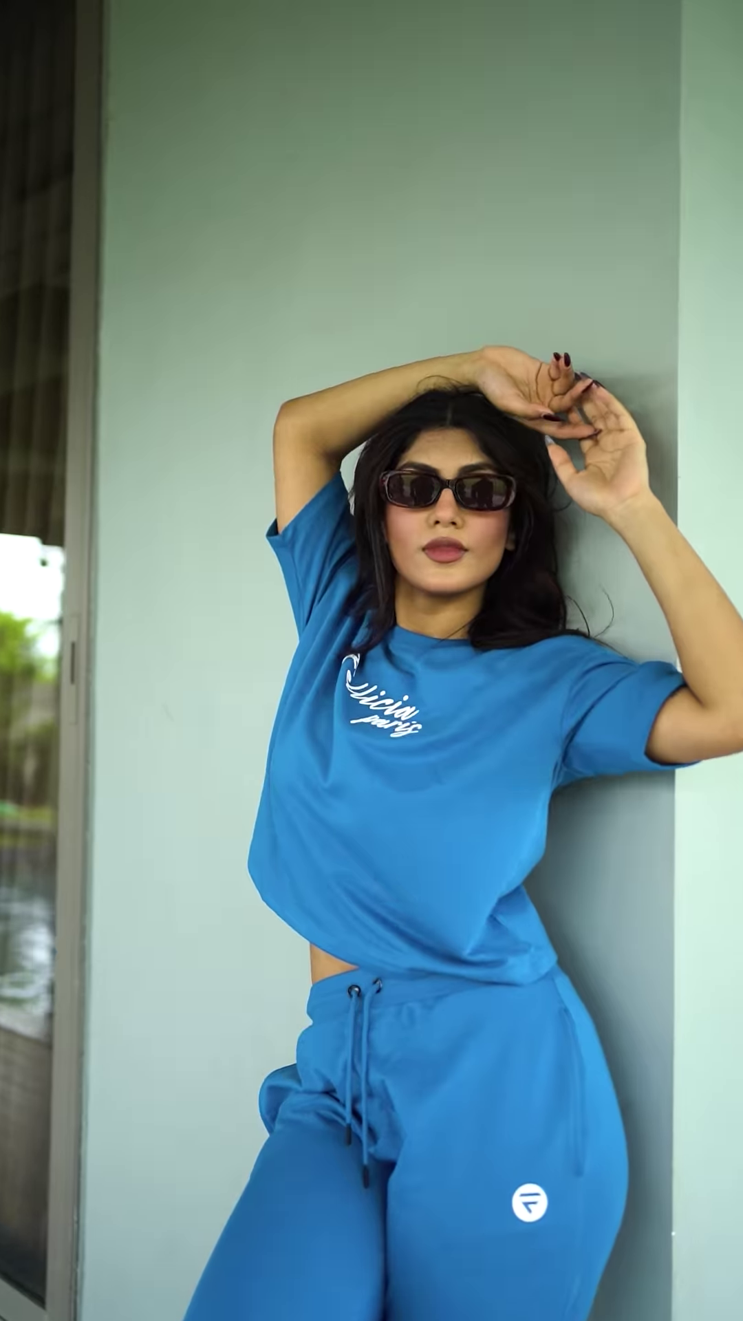 Styled with classic white sneakers, the outfit gains a fresh contrast that enhances its casual appeal. The person stands on a wooden floor in front of a glass window, with greenery and architectural elements visible in the background—adding lifestyle realism and boutique depth to the image. This setup supports captions like “Pop of Pink,” “Street Style Energy,” or “Athleisure in Motion.”
