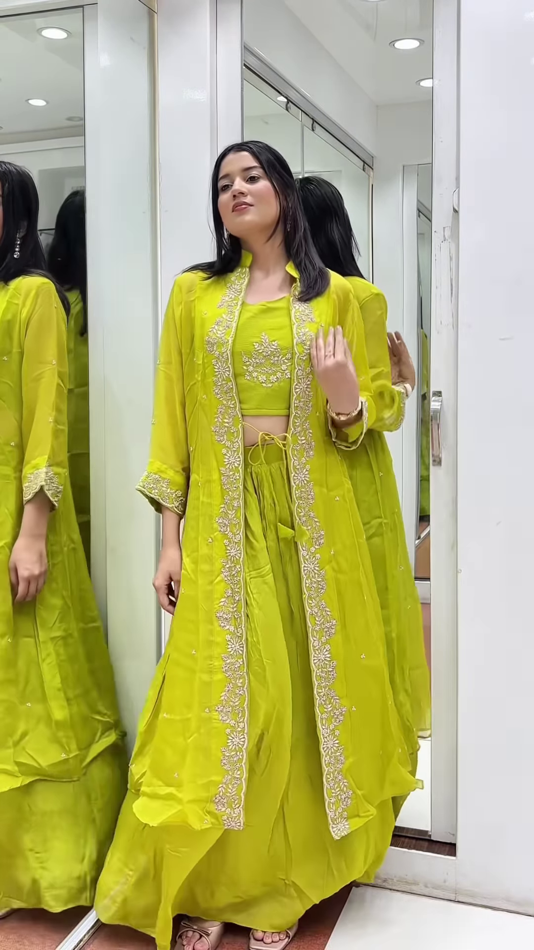 This image showcases a striking three-piece palazzo set in a vibrant lime green hue, exuding a fresh and contemporary ethnic style. The ensemble includes a cropped top, wide-legged palazzo pants, and a long, open-front jacket or shrug, all featuring delicate gold-toned embroidery.