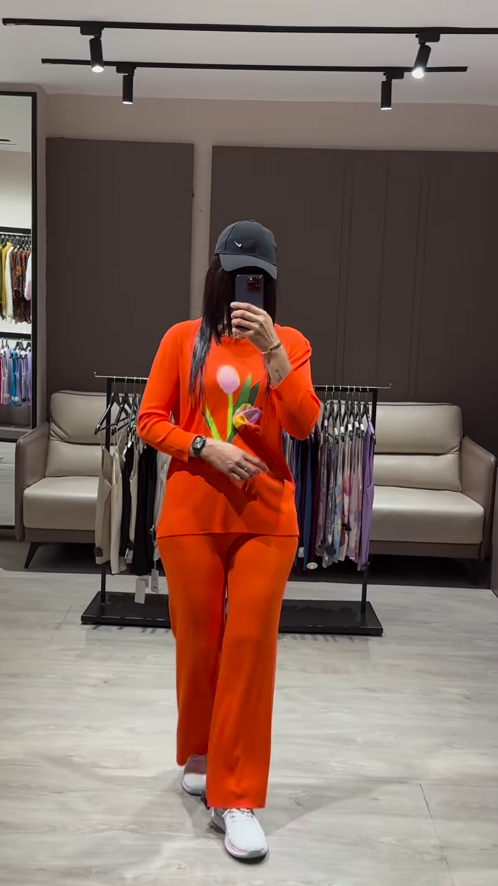 Embrace cozy comfort and vibrant style with this eye-catching vibrant pink knit lounge set, perfect for relaxed days at home in Ahmedabad, Gujarat, India, or for stepping out in comfortable fashion. This two-piece set includes a long-sleeved knit sweater and matching wide-leg pants, both crafted in a striking shade of pink and featuring a charming floral appliqué detail.
