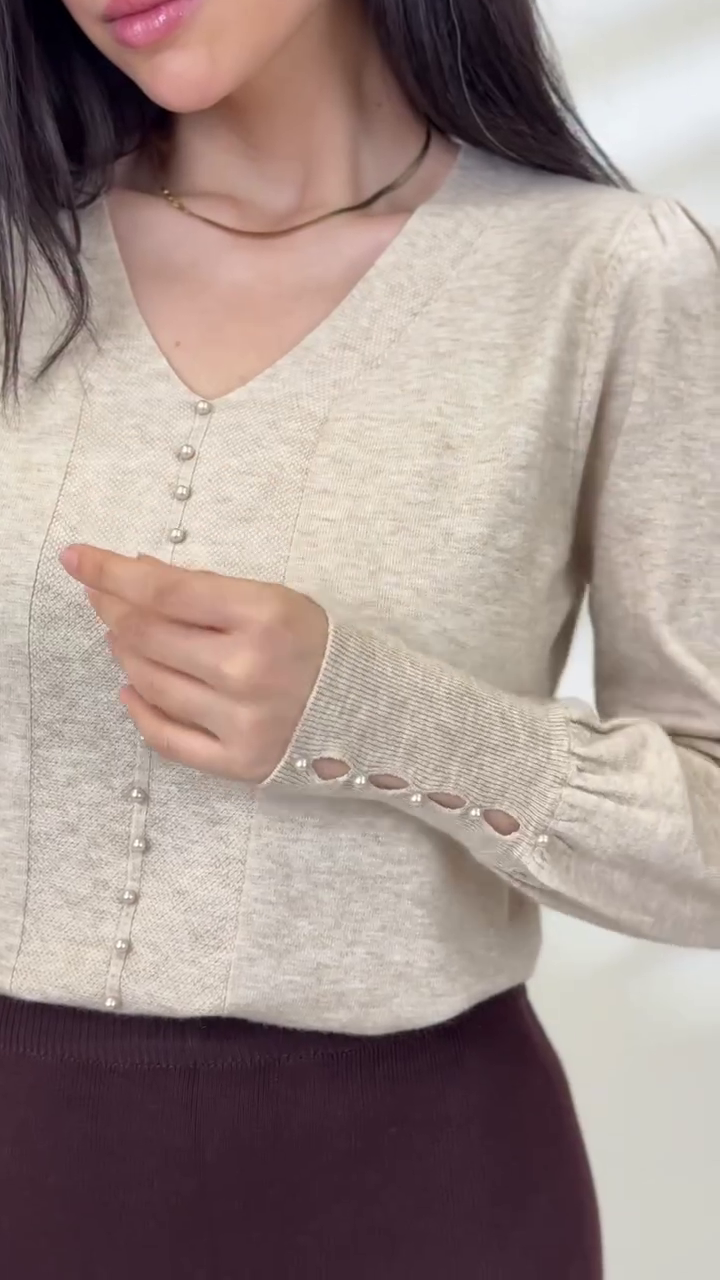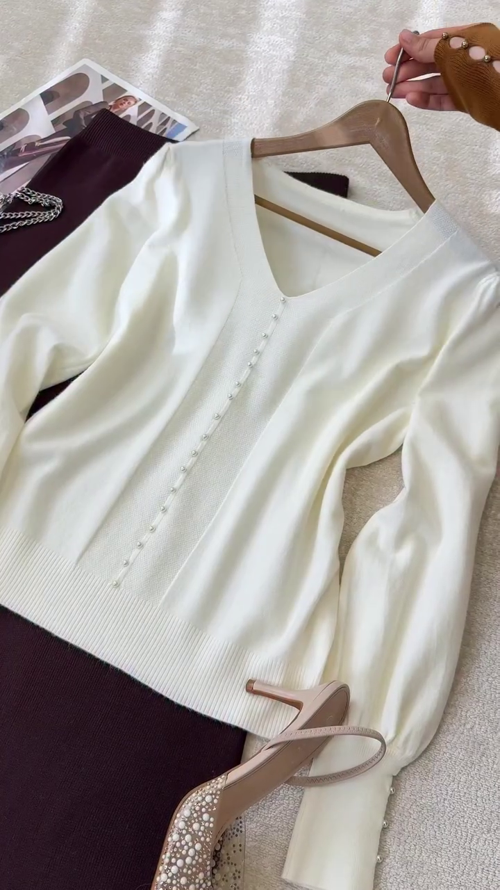 🍫 Elegant Pairing: Stunning brown V-neck puff sleeve top paired with a cream pleated skirt for a chic and graceful look.