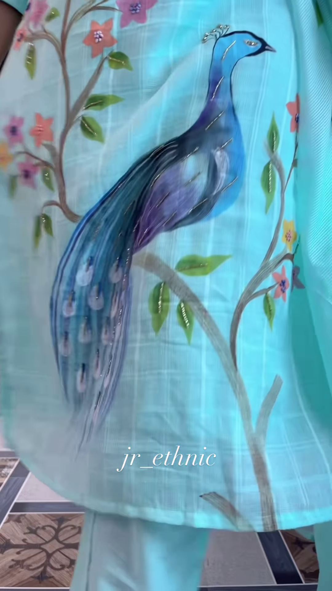 Presented indoors against a printed tile floor, the visual setting reinforces cultural richness and retail intimacy. Wall-mounted screens and decorative flooring hint at a curated shoot setup or in-store campaign, while the text “jr_ethnic” subtly brands the look for boutique recognition.