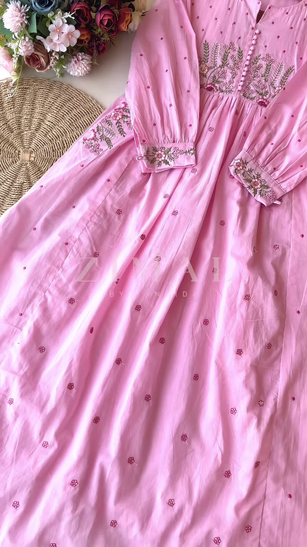 The kurti features a pastel green base embroidered with evenly spaced floral motifs in soft pink and white tones. The pattern is concentrated across the chest panel, sleeves, and lower hem—arranged in cascading symmetry that draws the eye vertically and flatters the full-length silhouette. Leafy flourishes and bloom clusters stitched in detailed precision add rhythm and texture, making the garment ideal for seasonal styling, festive errands, or ethnic workplace ensembles.
