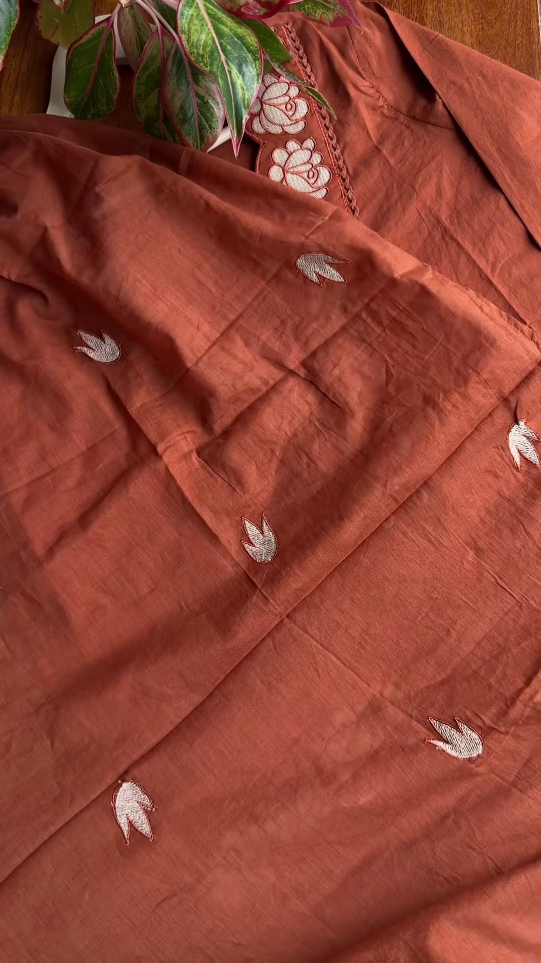 The kurti’s base fabric is soft with a slightly crinkled texture, offering breathable comfort and natural drape. Its warm reddish-brown hue evokes grounded sophistication, ideal for transitional weather or festive daywear. The neckline is the focal point, adorned with symmetrical floral embroidery in lighter thread tones that create contrast and visual rhythm.