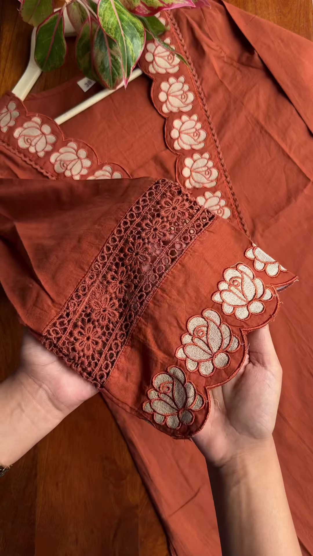 A visible size tag marked “38” confirms medium-range sizing, making it easy to format catalog entries or WhatsApp broadcast listings. The partial presence of green leaves in the frame adds a natural styling element, suggesting seasonal freshness and lifestyle realism—ideal for campaign visuals or ethnicwear carousel drops.