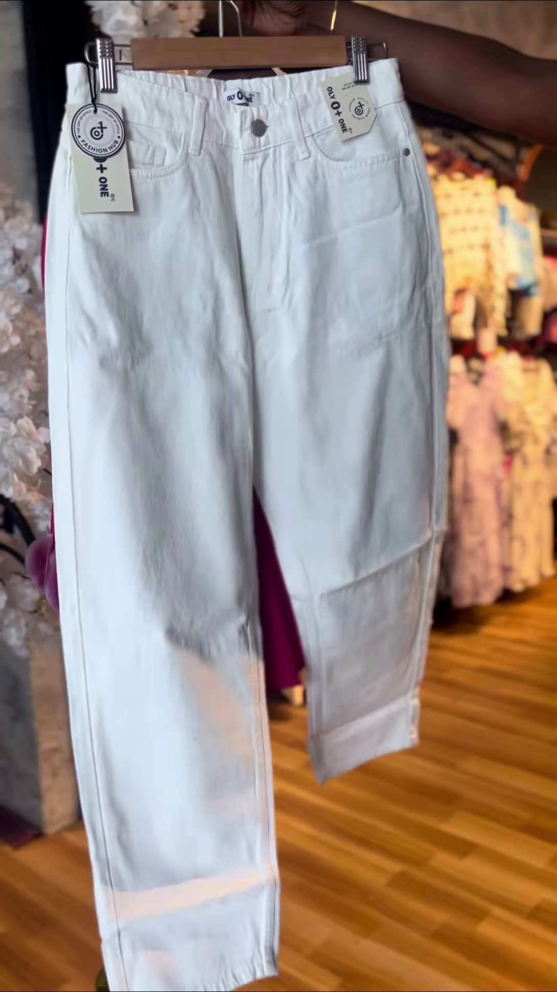 Paired with the top are classic white slim pants that serve as the perfect grounding piece for the vibrant upper layer. The clean lines and tapered fit offer a contemporary silhouette, ideal for accentuating the waist and elongating the legs. Whether styled with the shirt tucked in for a polished look or left loose for casual charm, the pants maintain a balanced and stylish appeal.